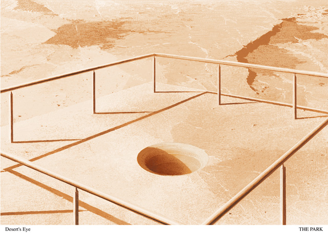 For easier access a concrete plattform was built around this Desert Eye opening into an enormus underground cavity which was ground into the rock by the spiraling motion of the Giant Slug.